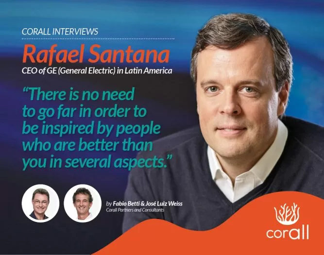 At 44 years of age, Rafael Santana carries great responsibility. He is the CEO of GE (General Electric) in Latin America, one of the largest and most inventive corporations in the world. In an interview of almost an hour with Corall´s blog, given in his office in São Paulo, to the Corall Partners Fábio Betti and José Luiz Weiss, Santana shared valuable tips on implementing transformation models and revealed the main challenges ahead for the organization in the region, including to be positioned globally among the five best companies to work.